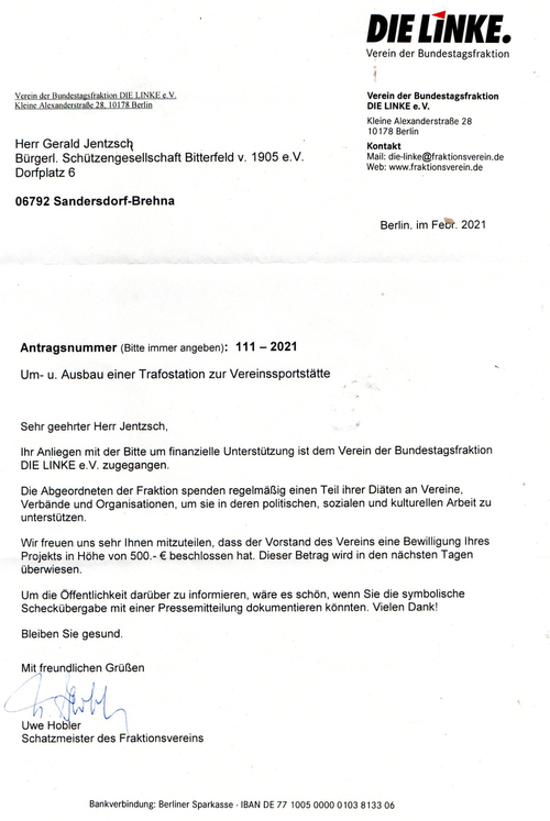 Vielen Dank an den Verein der Bundestagsfraktion DIE LINKE die uns mit einer großzügigen Spende zum realisieren unserer Baumaßnahmn bedacht hat.